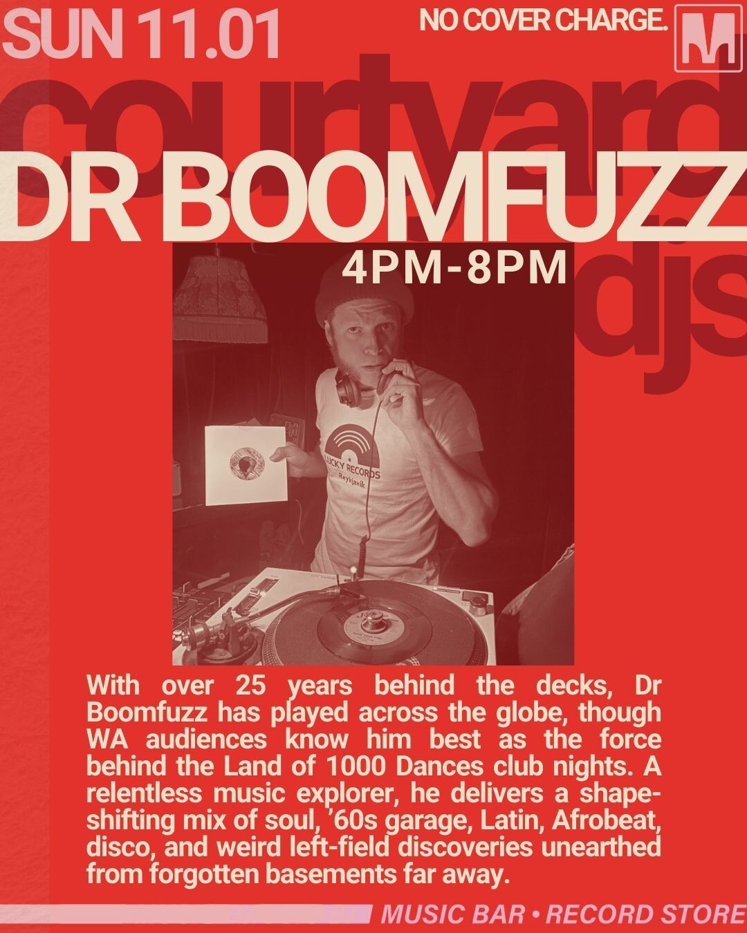 With over 25 years behind the decks, Dr Boomfuzz has played across the globe, though Perth audiences know him best as the force behind the Land of 1000 Dances club nights. A relentless music explorer, he delivers a shape-shifting mix of soul, ’60s garage, Latin, Afrobeat, disco, and weird left-field discoveries unearthed from forgotten basements far away.