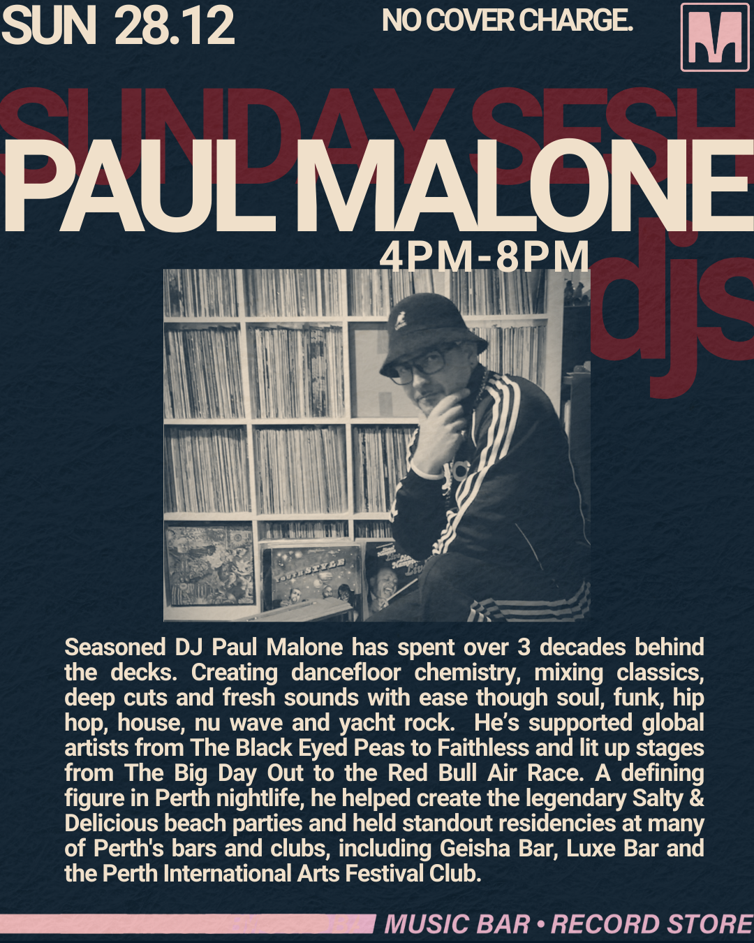 Seasoned DJ Paul Malone has spent over 3 decades behind the decks. Creating dancefloor chemistry, mixing classics, deep cuts and fresh sounds with ease though soul, funk, hip hop, house, nu wave and yacht rock. He’s supported global artists from The Black Eyed Peas to Faithless and lit up stages from The Big Day Out to the Red Bull Air Race. A defining figure in Perth nightlife, he helped create the legendary Salty & Delicious beach parties and held standout residencies at many of Perth's bars and clubs, including Geisha Bar, Luxe Bar and the Perth International Arts Festival Club.