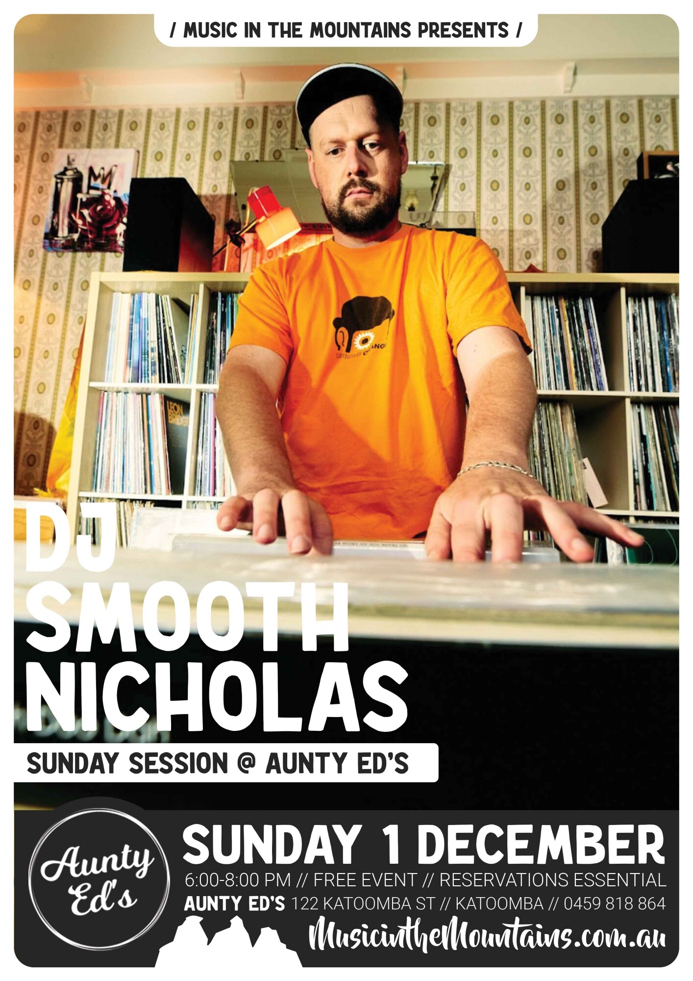 DJ SMOOTH NICHOLAS: SUNDAY SESSION // Sunday, 1 December 2024 // 6:00-8:00 pm// Free Event; Reservation Recommended // Venue: Aunty Ed’s; 122 Katoomba St, Katoomba.