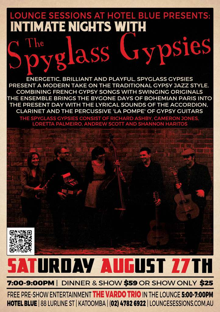 The Spyglass Gypsies launched their debut self-titled album of original music to a full house in February 2014, and in 2015 as Australian Arts Council grant recipients took their music to all corners of the country with their national tour. Established in 2010 by Ashby and Palmeiro, the group formed through studying and performing together in various jazz projects. They have appeared at many notable venues and festivals, among these a headlining performance at the 2013 Oz Manouche Gypsy Jazz Festival (Brisbane), the 2014 Red Earth Festival in Karratha, and in 2015 they performed at the Ellington Jazz Club in Perth with luminary Hank Marvin as their special guest. Along with supporting performances for international stars such as Dutch guitar virtuoso Lollo Meier, UK guitarist Remi Harris and most recently Portuguese fado star Ana Moura at the Enmore Theatre, Spyglass Gypsies have established themselves as one of the leading ensembles in Australasian Gypsy Jazz.