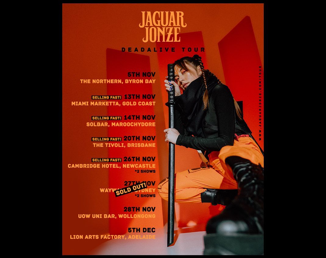 Jaguar Jonze returns for her 'DEADALIVE' tour after what has been a hell of a year. In 2020, she performed on Eurovision: Australia Decides with her single 'Rabbit Hole,' sold out her first national headline tour and then headed to her first US tour, which didn’t quite go to plan and dramatically altered her year. Over in New York, Jonze and the band were stuck in lockdown but eventually found flights back home to Australia where she then tested positive to COVID-19. Spending 40 days in hospital, she released her debut EP 'Diamonds & Liquid Gold' in the back of an ambulance. After a gruelling year of recovery, Jonze is back with her first single 'DEADALIVE' which she recorded while under hospital care. Jaguar Jonze is nothing short of a manifold visionary and tickets to her comeback tour won't last long.
