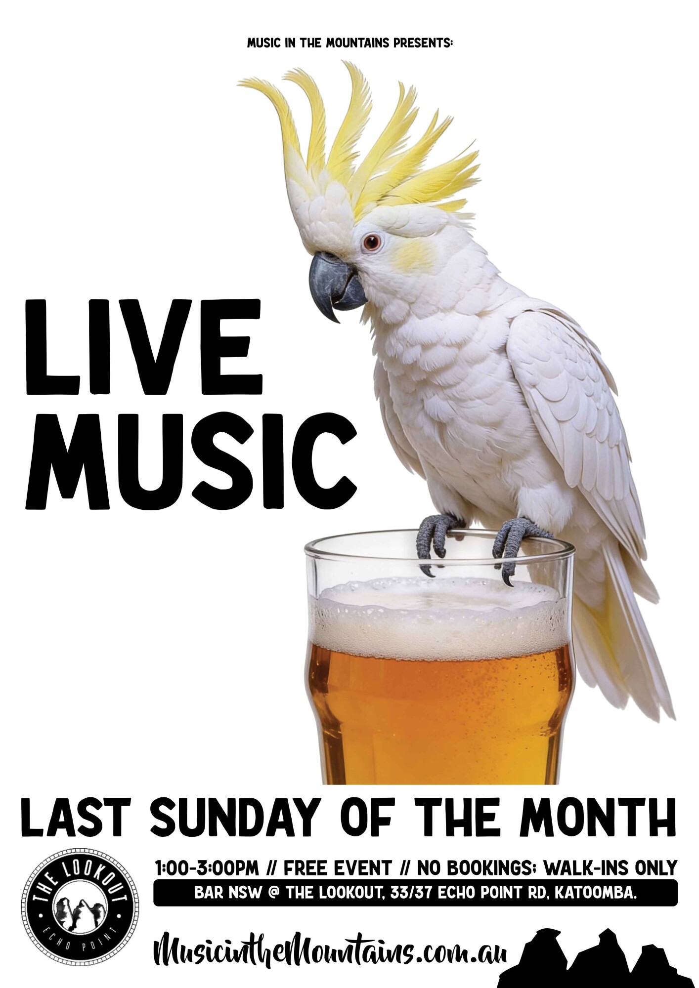 TBA: LIVE @ THE LOOKOUT // Sunday, 26 April 2026 // 1:00-3:00 pm // Free Event; No Bookings: Walk-Ins Only // Venue: Bar NSW; The Lookout @ Echo Point; 33 Echo Point Rd, Katoomba.