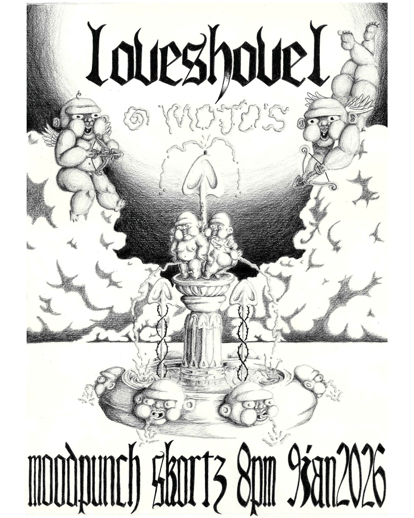 525 days between shows. 12,600 hours with no shovel. 756,000 minutes of fantasy daydream digging. 45,360,000 seconds slipping silently into the abysssss. The wait and the weight will soon be history. But you will be there. Bursting with joy. Bouncing off the fucking walls. The sweetsick taste of a tiny excitement-vom in your mouth. The guitar will sear your synapses and the bass will rattle your wee ribcage. The drums will lead the beat of every heart in the room while a raw raging roar of words you’ve been longing to hear will rip through your ears. Yesssss! loveshovel are back. One night only with beautiful friends for all of you beautiful friends. Witness the love with Mood Punch, Skortz, NEAPOLAXI VS BABY BAT. All for one neat price in one sweet place. 9 January 2026. Mojo’s Bar. 8pm. Don’t be late. Handmade individual and very exclusive pieces of loveshovel merch free for the first fifty folks through the door. Oh fuk yeh.