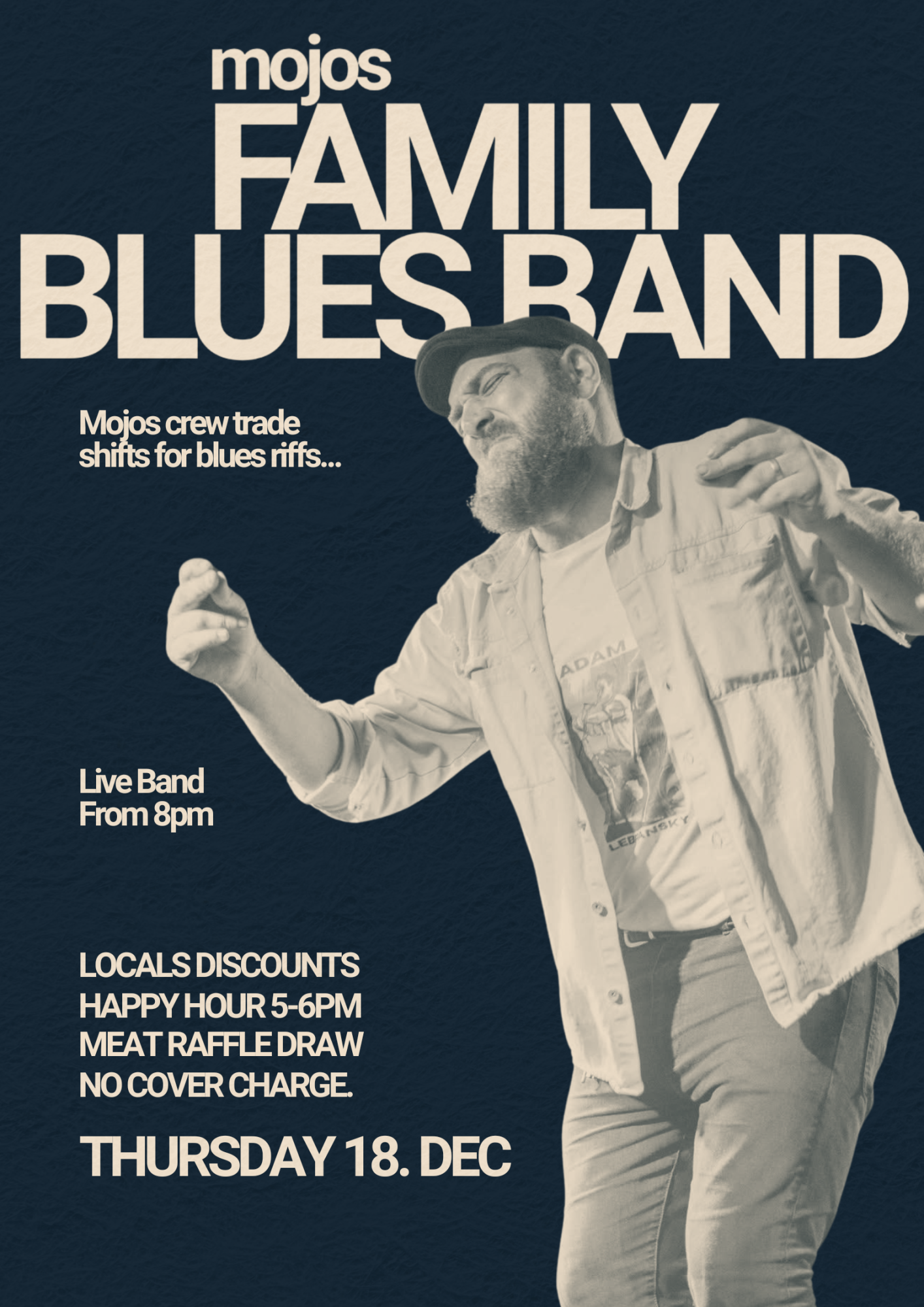 MOJOS FAMILY BLUES BAND onstage from 8pm ~ a rag tag bunch of mojos staff trading shifts for riffs.