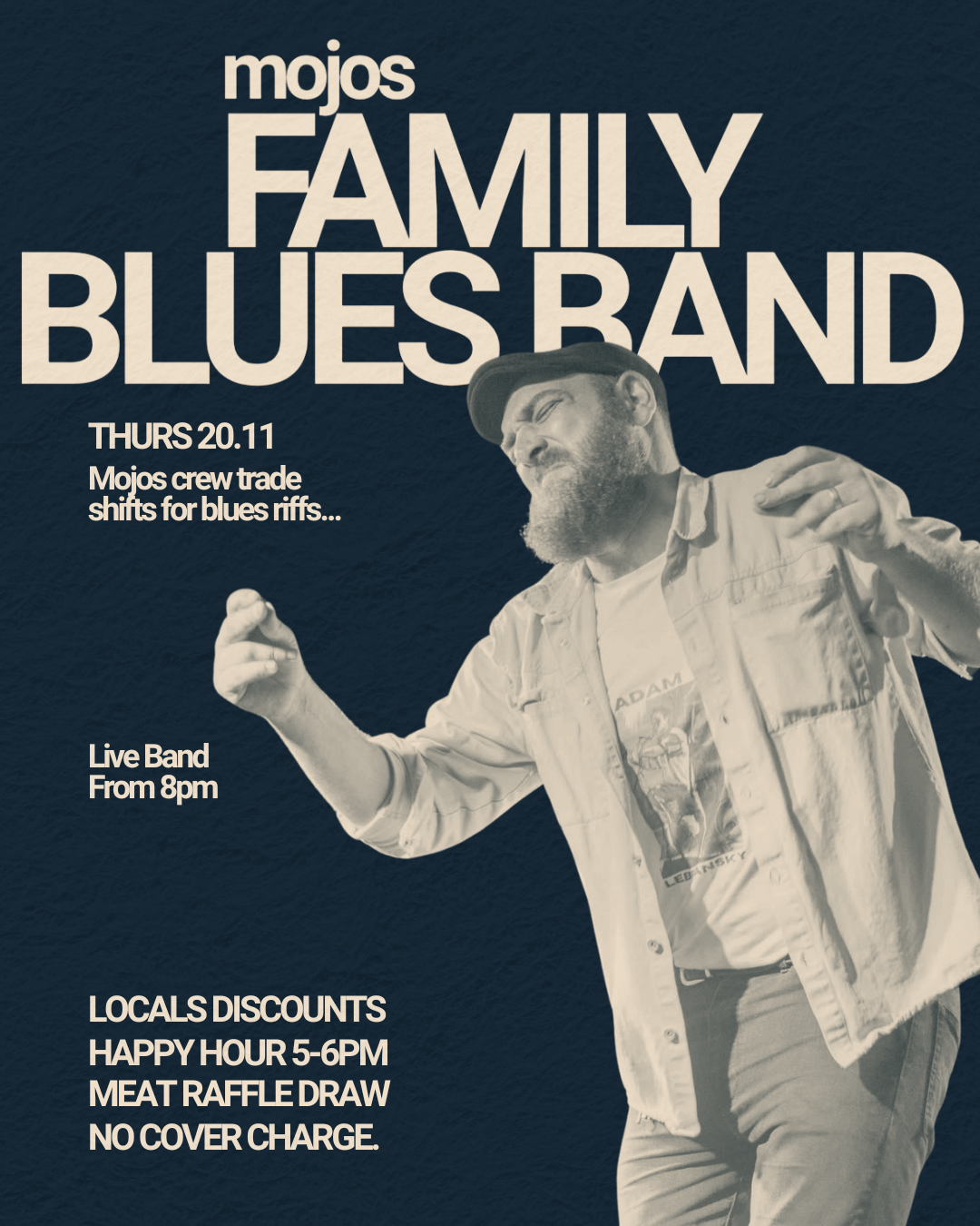 MOJOS FAMILY BLUES BAND onstage from 8pm ~ a rag tag bunch of mojos staff trading shifts for riffs.