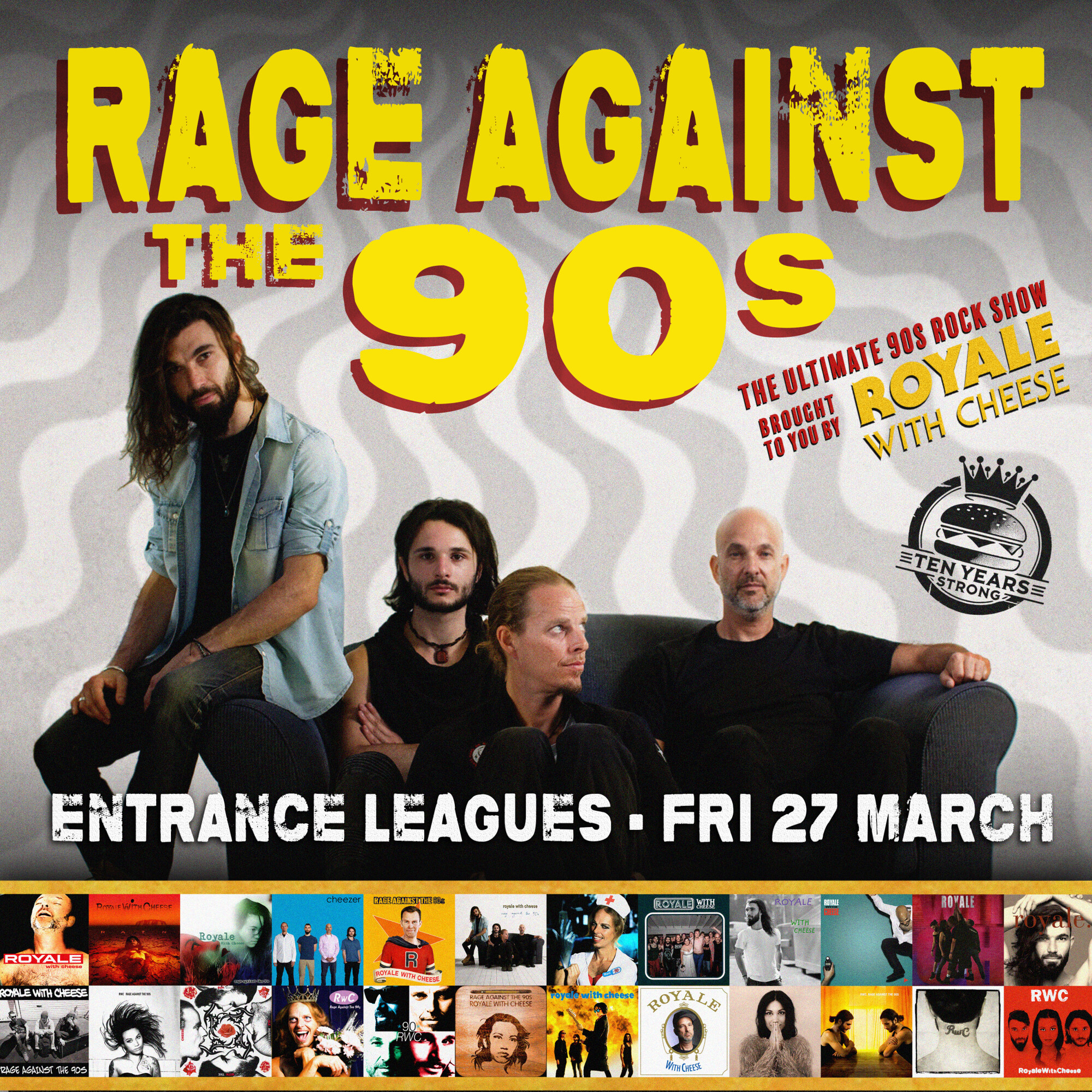 NOW TEN YEARS STRONG, Sydney's Royale With Cheese Royale with Cheese is AUSTRALIA’S PREMIER 90s ROCK SHOW, playing all 90s rock and pop covers – from Seattle-sound to Grunge to Britpop and all the best Oz Rock from the 90s.