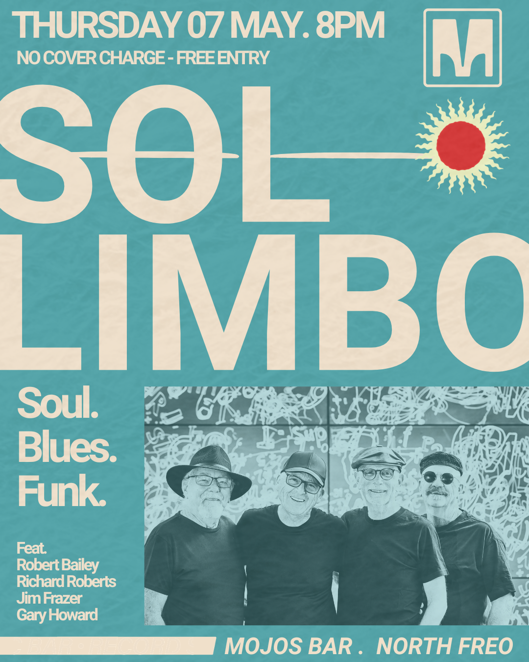 SOL LIMBO take to Mojos Bar, Fremantle on May 7th, bringing their groove full circle. Long before Mojos became the iconic venue it is today (back when it was still known as The Stoned Crow). Robert, Jim and Richard were already tearing it up on this very stage as 'It's Life Jim'