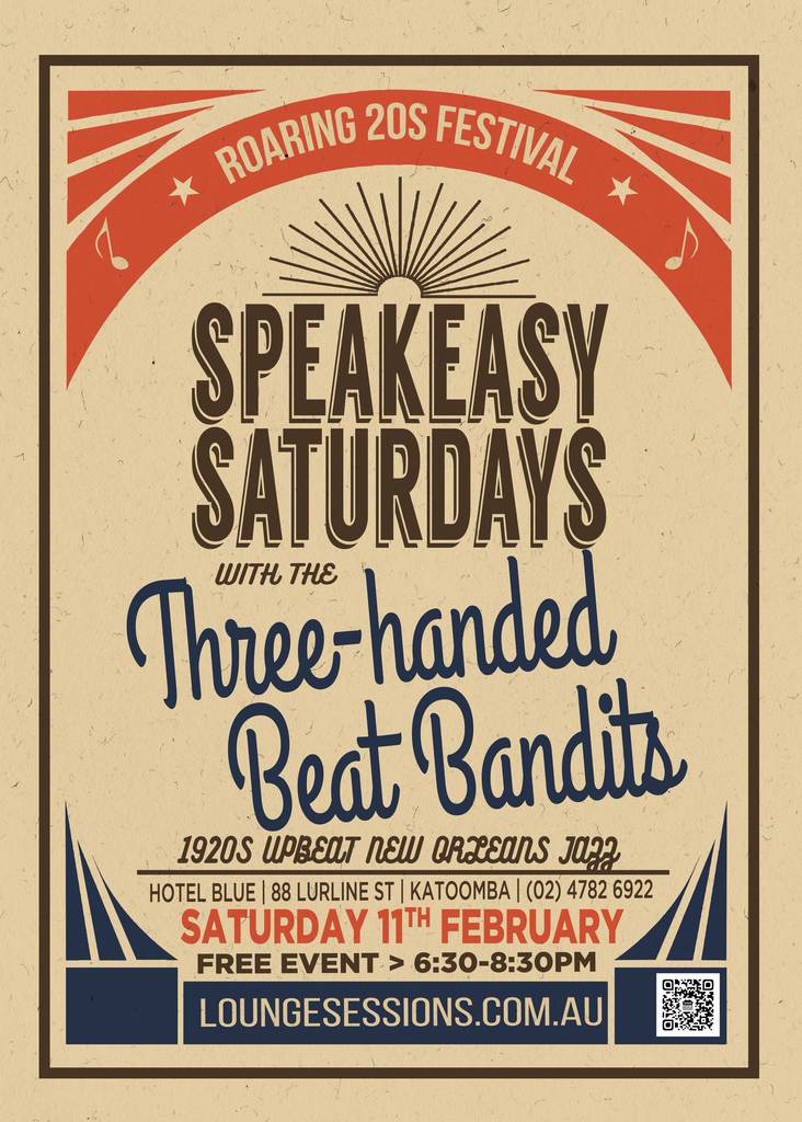 The 1920s came in “with a bang of bad booze, flappers with bare legs, jangled morals and wild weekends. The parties were bigger…the pace was faster…and the morals were looser.” Well, thankfully those days have passed, but in the spirit of those ‘fleeting days of folly’, come along to Hotel Blue Saturdays Nights in February for some Roaring 20s jazz & cocktails. This week the Three-handed Beat Bandits are joining us - Two artists, three hands, drums, saxophone, guitar and megaphone – crunch the numbers and you will find something doesn’t add up! John Stuart and Neil Duncan are not your average jazz duo – come along and find out why! 6:30-8:30pm, bar & kitchen open, free event. Hotel Blue, the Mountains' own 'House of Jazz'.