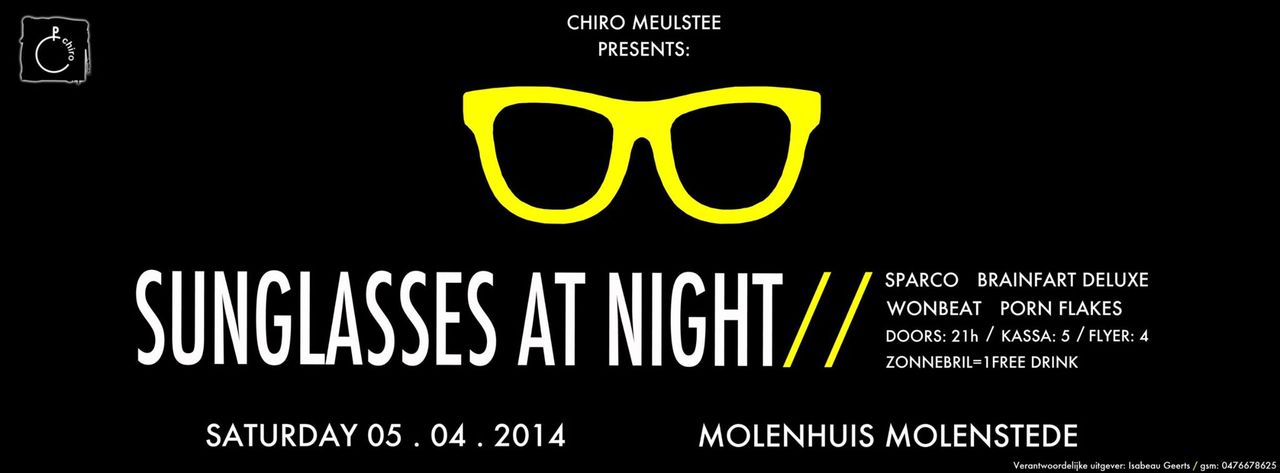 Chiro Molenstede presents: Sunglasses @ night! Zet de datum alvast in je agenda!21u - 23u WONBEAT23u - 1u Dj Porn Flakes1u - 3u Sparco3u - 5u Brainfart Deluxe Inkom = 5 euroMet flyer -> 4 euroZonnebril aan = one free drink !